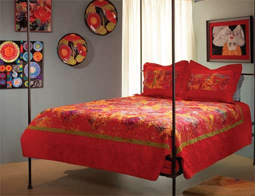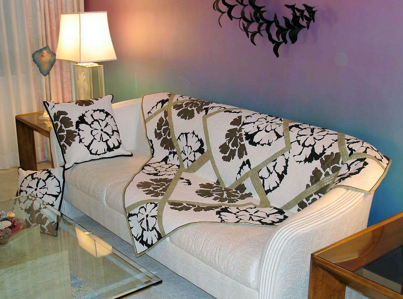 A quilt and matching pillows made from my hand printed material. One of a kind.