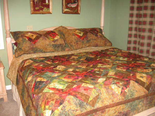 Autumn Splendor This couple sent me some paint chips and a scarf for the color choices. I sent them 2" strips of fabric to choose from for their quilt and asked for a preference for the star colors and the outside borders. The rest was up to me making it look good and the way I like them to look. They were thrilled with the king and shams.